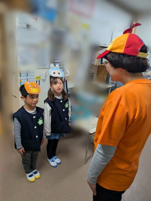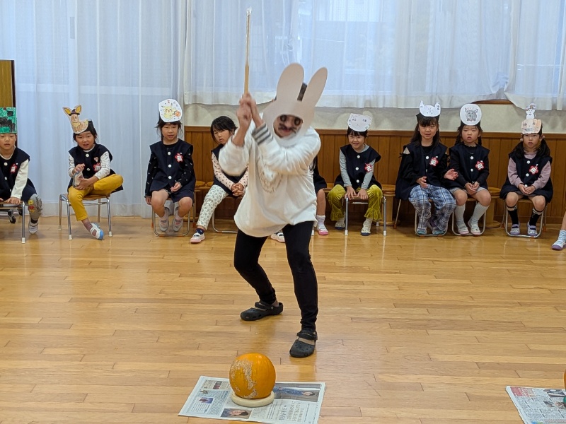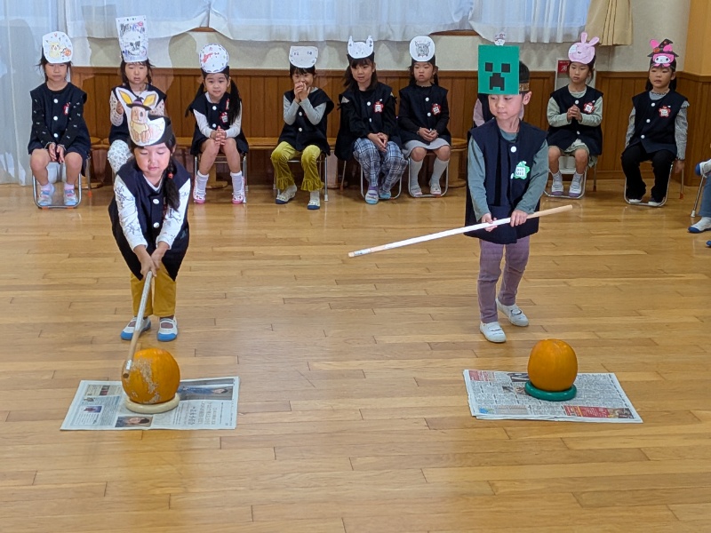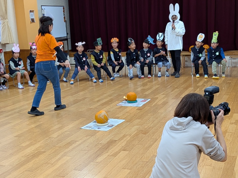 2025年10月31日園長ブログ2024年度まで 令和7年10月31日(金) ☆ハッピーハロウィン☆ 今朝のお当番活動 当番から欠席報告を受ける先生にウケる 年長組 カメラマンさんが激写する中でのゲームあそび 今日は先生たちもちょっとした仮装をたしなんでおります クラス対抗 かぼちゃ割り大会 ミッフィーちゃん渾身の振り下ろし(その目は見えとるんや!)